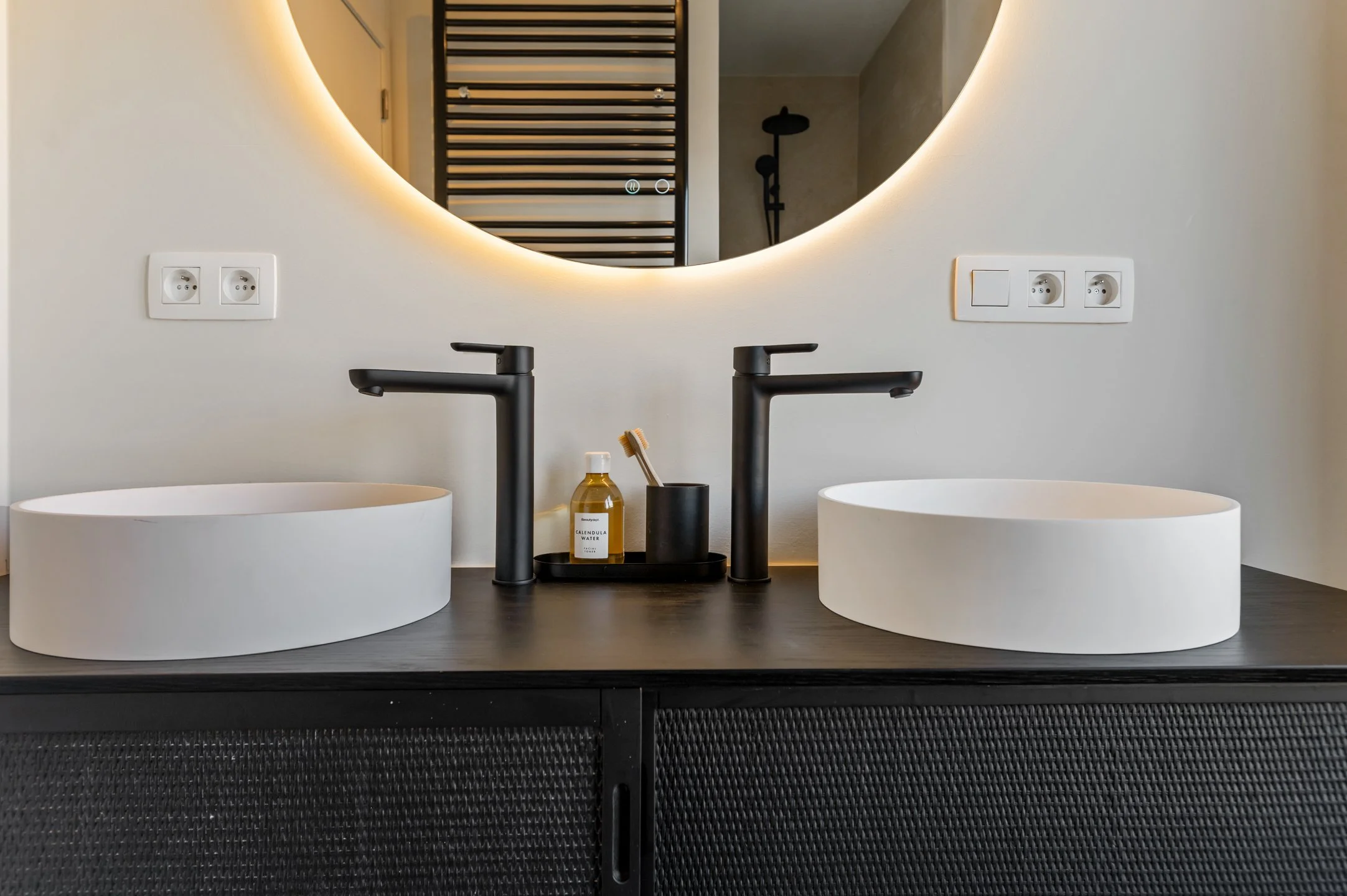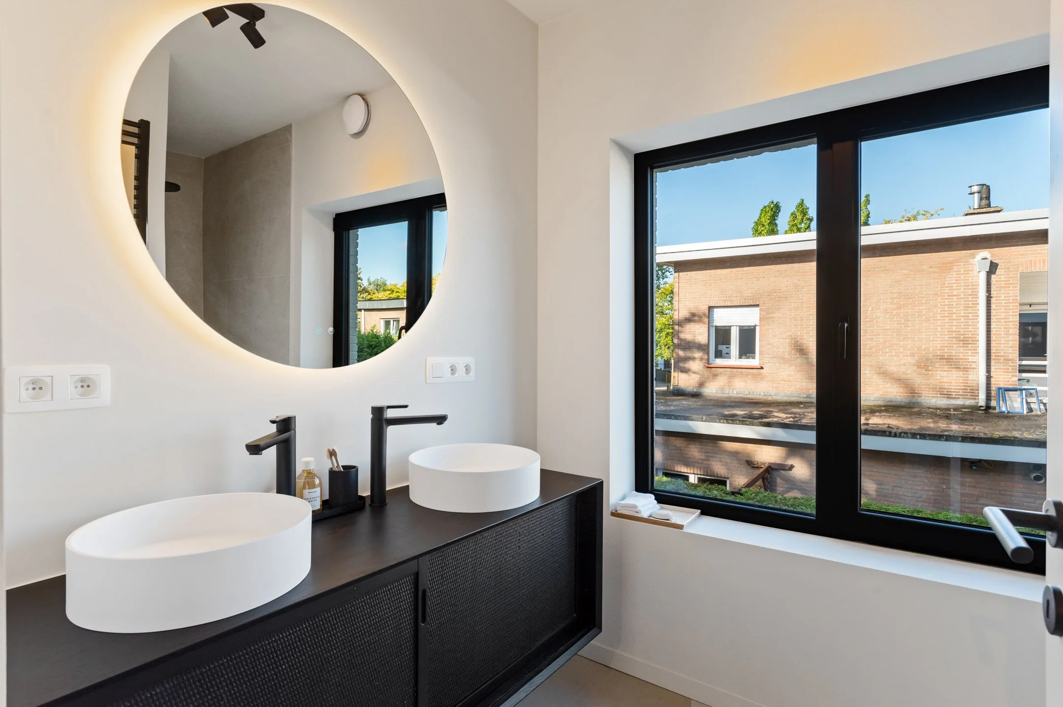 Twee stijlvolle badkamers met een hoogwaardige afwerking en tijdloze materialen die comfort en rust uitstralen.