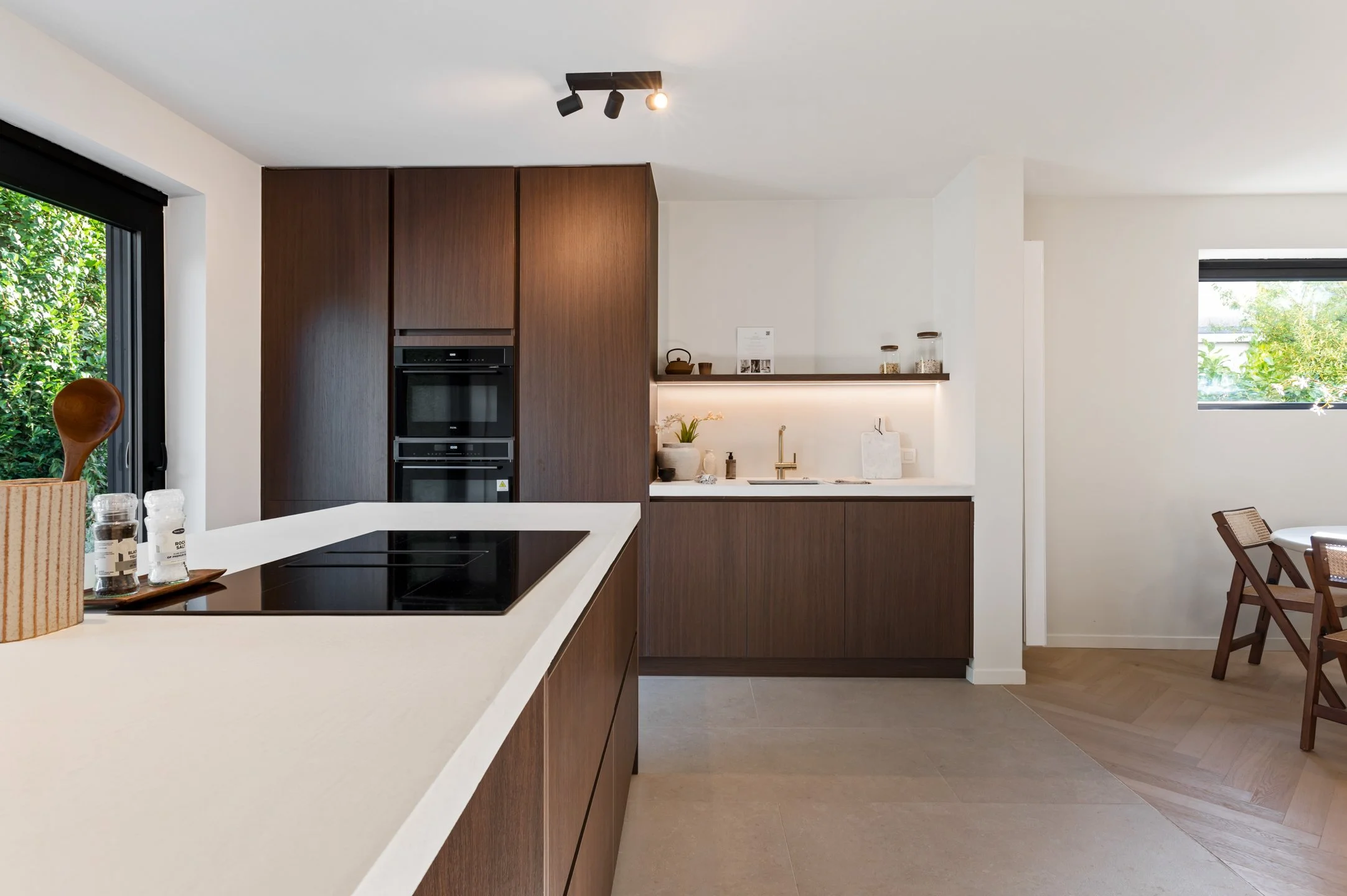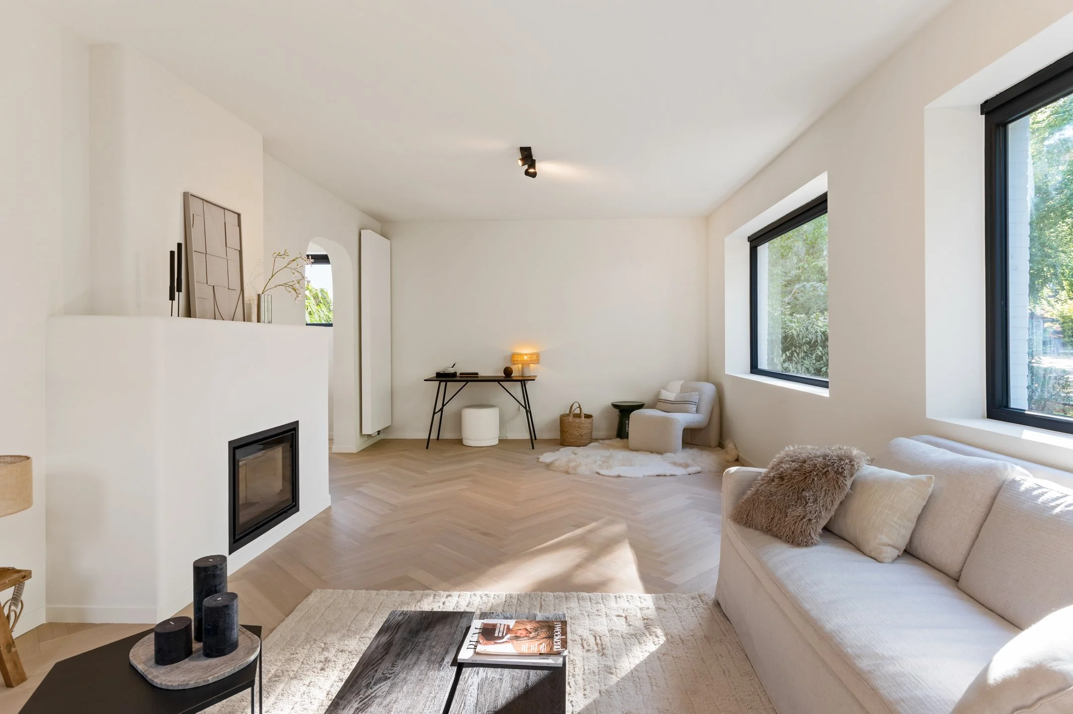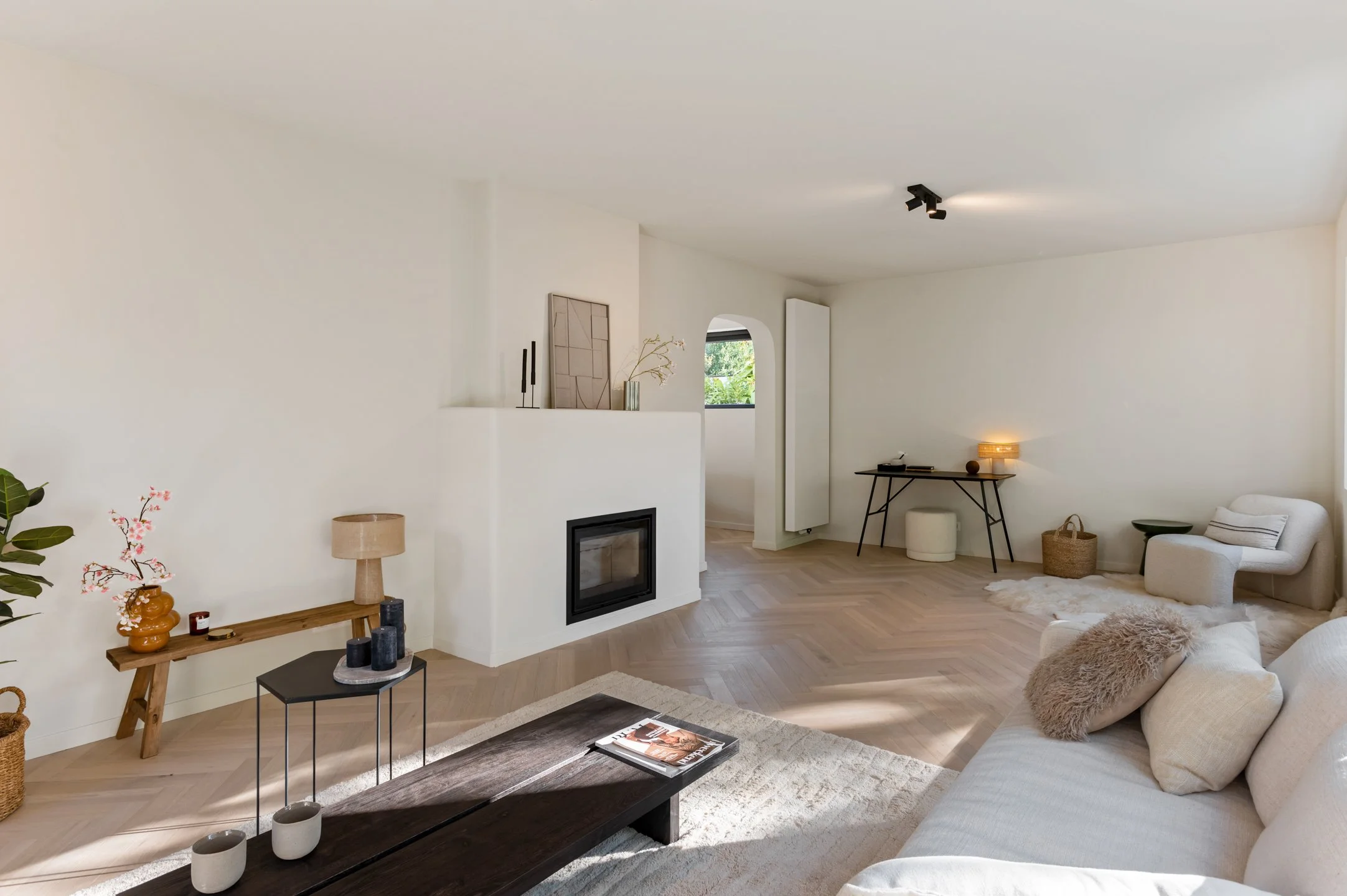Een open leefruimte waarin de keuken, eetkamer en woonkamer moeiteloos in elkaar overvloeien. De gezellige living met open haard sluit via grote raampartijen aan op het terras en de tuin, wat zorgt voor een prachtige lichtinval en een natuurlijke verbinding met buiten.